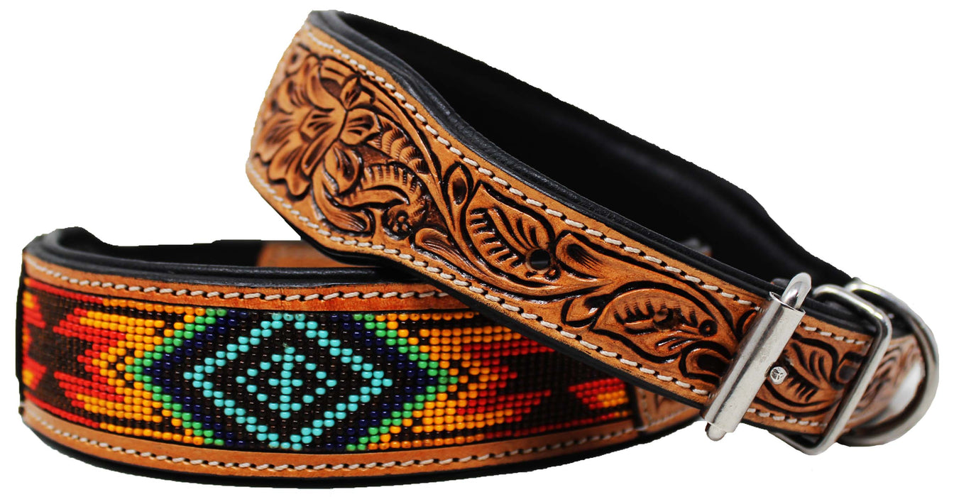 Challenger heavy-duty dog collar hand crafted from 100% genuine full grain leather and double stitched to endure everyday use. Dog collar is accented with a hand-tooled floral design, and features a unique multicolor beaded pattern inlay. Soft padded back provides comfort, and helps to prevent irritation to your dogs fur or skin. Collar includes a dee-ring to easily attach identification tags or medical information. Complete with rust-free stainless steel hardware. Sizing: X-Small: 9" - 13" L x 1 1/4" W Small: 13'' - 17'' L x 1 1/4" W Medium: 17’’ - 21'' L x 1 5/8" W Large: 21'' - 25'' L x 1 5/8" W