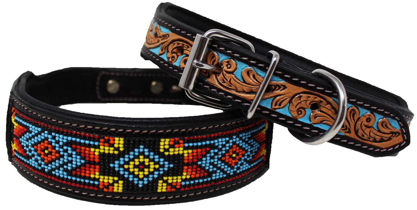 Challenger heavy-duty dog collar hand crafted from 100% genuine full grain leather and double stitched to endure everyday use. Dog collar is accented with a hand-tooled floral design, and features a unique multicolor beaded pattern inlay. Soft padded back provides comfort, and helps to prevent irritation to your dogs fur or skin. Collar includes a dee-ring to easily attach identification tags or medical information. Complete with rust-free stainless steel hardware. Sizing: X-Small: 9" - 13" L x 1 1/4" W Small: 13'' - 17'' L x 1 1/4" W Medium: 17’’ - 21'' L x 1 5/8" W Large: 21'' - 25'' L x 1 5/8" W