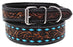 Challenger heavy-duty dog collar handmade from genuine full grain leather that is double stitched for durability. Perfect for daily use, and training activities. Dog collar is accented with a hand tooled antique floral design, and turquoise buckstitch edges. Complete with rust-free stainless steel hardware. Soft padded back provides comfort, and helps to prevent irritation to your dogs fur or skin.