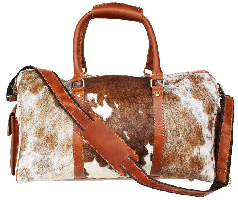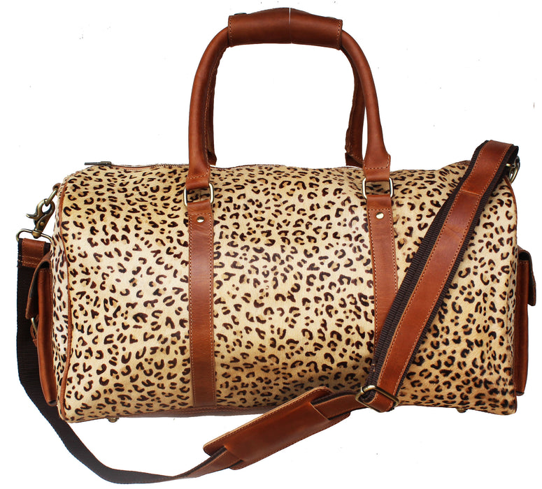 Challenger duffle bag hand crafted with a beautiful multicolored woven cotton southwest pattern, and genuine full-grain leather accents to ensure durability. Perfect choice for travel, and weekend trips. Conveniently sized roomy bag fits most airline overhead bins. Adjustable and removable shoulder strap makes it easy to carry. Main compartment has a full zipper closure with a wide opening to easily access your belongings. The fully lined interior also features a side zippered pocket, and two open pockets for additional storage. Bag measures 20.5" L x 10.5" W x 15" 11" H providing plenty of room for all of your essentials.