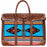 Challenger duffle bag made from handwoven wool, and genuine full-grain leather to endure everyday use. This bag features a multicolor Aztec print, with floral tooled two-tone leather accents. Perfect choice for travel, and weekend trips. Conveniently sized roomy bag fits most airline overhead bins. Includes a removable shoulder strap. Main compartment has a full zipper closure with a wide opening to easily access your belongings. The fully lined interior also features a side zippered pocket, and two open pockets for additional storage. There are also zippered pockets at the back of bag to store easily reachable items. The antique finish brass hardware beautifully ties the bag together. Bag measures 20" L x 8" W x 15" H providing plenty of room for all of your essentials.