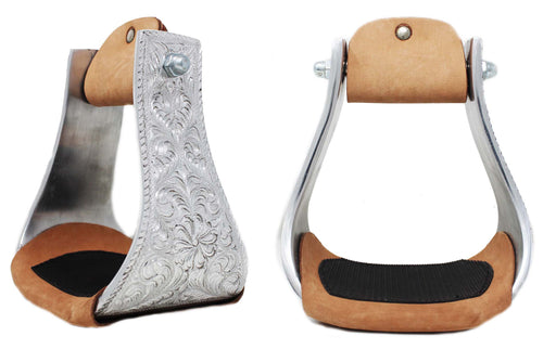 Challenger barrel stirrups made from durable, lightweight aluminum. Stirrups come accented with engraving and turquoise rhinestones. Leather tread features rubber grip to help with slippage.