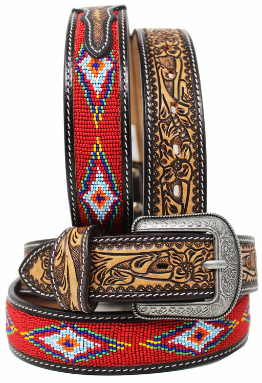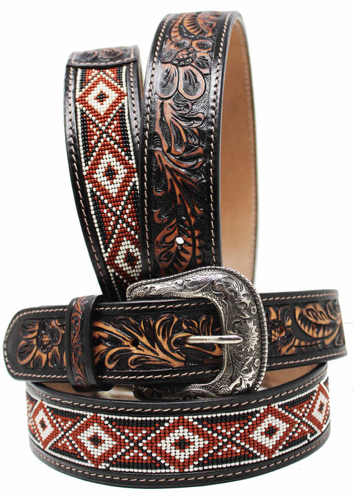 Western Antique Floral Tooled Beaded Full-Grain Leather Belt 26FK30