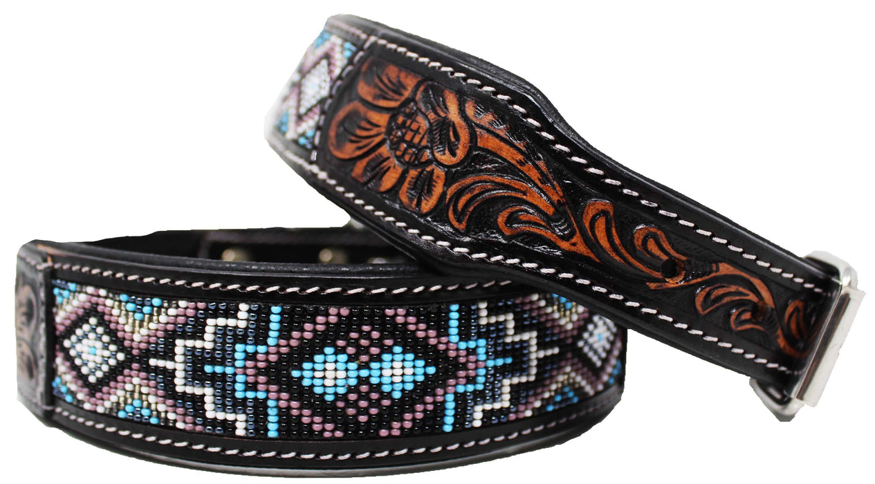 Challenger heavy-duty dog collar hand crafted from 100% genuine full grain leather and double stitched to endure everyday use. Dog collar is accented with a hand-tooled floral design, and features a unique multicolor beaded pattern inlay. Soft padded back provides comfort, and helps to prevent irritation to your dogs fur or skin. Collar includes a dee-ring to easily attach identification tags or medical information. Complete with rust-free stainless steel hardware.