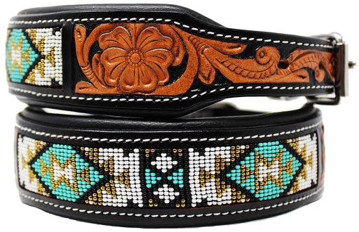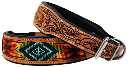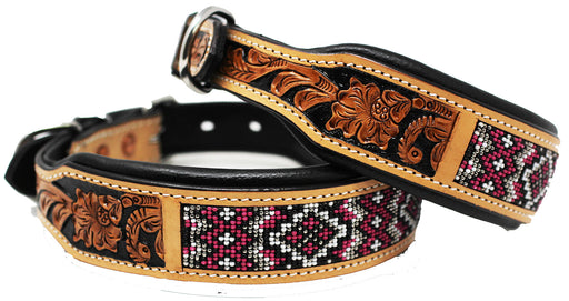 Hand Tooled Floral Padded Leather Beaded Dog Collar Floral Hand Tooled 60HR17