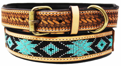 'Challenger genuine handmade full grain leather heavy-duty dog collar comes fully padded for comfort. Collar is accented with a beaded pattern inla...