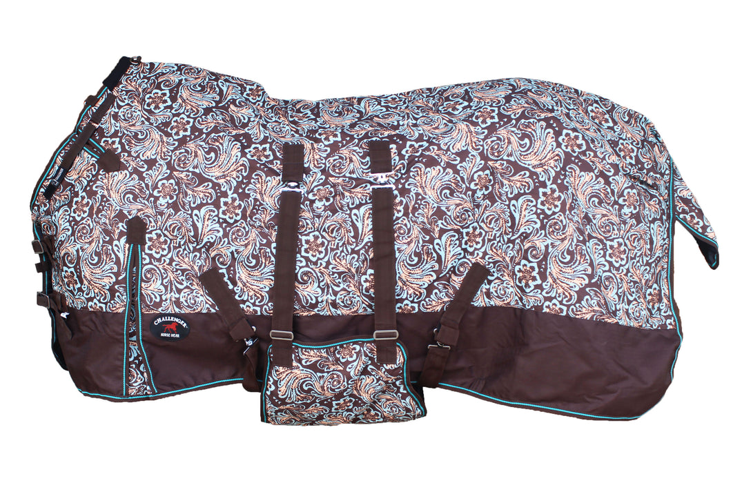 Challenger 1200 Denier turnout horse sheet is constructed with a rip-stop waterproof, windproof, and breathable poly outer shell with 210 lining. Blanket features adjustable double front buckle snap closure, cross surcingles, neck adjust, and elastic leg straps for a secure and snug fit. Tail flap for added protection. Shoulder gussets offers freedom of movement. Fleece wither protection. Nickle plated hardware. No Insulation, No Fill inside.