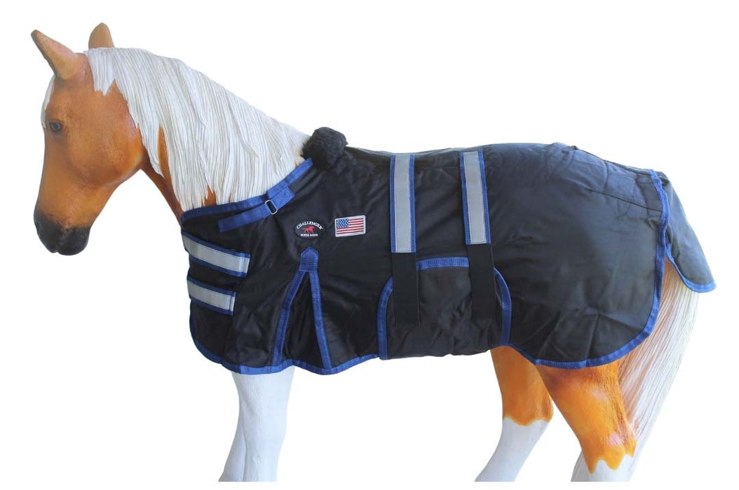 Challenger foal medium-weight turnout blanket is waterproof and breathable, allowing your horse to stay comfortable in many weather conditions. Made of 1680 Denier heavy duty rip-stop outer for durability, and 150g of Polly-Fill providing warmth and wind protection. Blanket features loop & pull Velcro straps, at the front, bellyband, and neck area for custom adjustable snug fit . The reinforced, double-sewn stress points offer additional reinforcement to help prevent tears, while the fleece wither helps provide protection from rubbing. Shoulder gussets allow for freedom of movement and help to prevent shoulder rubbing. Additional features include a removable tail cover that provides additional protection from moisture, rust-free stainless steel hardware, and a tail cord.